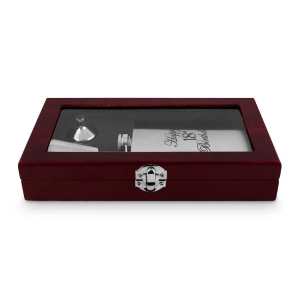 This sleek hip flask is the perfect gift for a 18th birthday. It comes complete with a cocktail mixing set, all in a latched wooden windowed gift box.