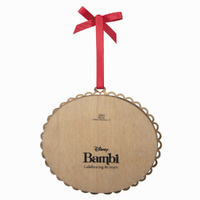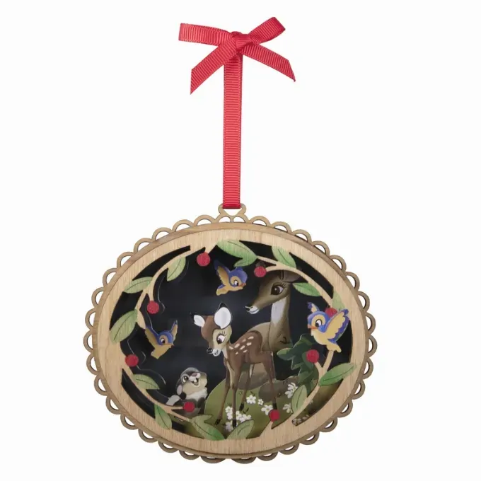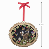 Treasure the joys of family and friendship with this sweet Christmas tree ornament. Pretty laser-cut wood frames an intricate papercraft scene featuring Bambi and his mother gathered in the woods with his bunny friend, Thumper, and blue birds. Celebrate the 80th anniversary of the classic animated movie with this charming decoration that makes a wonderful gift for Disney fans of all ages.