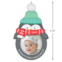 Welcome the newest member of the family with this photo holder Christmas tree ornament. The fun design features a penguin bundled up in scarf and hat with a "Baby's First Christmas" message. Insert baby's photo into the opening in the center of the decoration for a very sweet presentation. Parents and grandparents alike will adore reliving memories each year when they display this year-dated ornament.