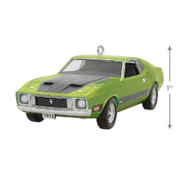 Add a classic to your tree and relive the days of rumbling muscle cars. This 1973 Ford Mustang Mach 1 features details like split hood scoops and a fastback roofline with wheels that turn. Die-cast metal car is painted in the classic Medium Green Irid body color with black stripe accents. Year-dated 2023 on rear license plate, this classic is sure to stand out on the tree!