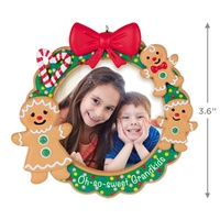 Grandparents and grandkids go together like the holidays and gingerbread cookies! Celebrate their special relationship with this sweet Christmas tree ornament featuring a wreath that looks like it's made of festively decorated cookies with a ribbon bow. Slip a photo into the center picture frame so grandma and grandpa can think of their grandchildren every time they look at this darling decoration.