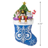 Be sure your stockings are hung with care with this addition to the Stocking Stuffers series. This festive Christmas tree ornament features a nutcracker, the Mouse King and Clara as a ballerina from the timeless ballet "The Nutcracker." A sparkling snowflake design on the stocking lends a fun finishing touch.