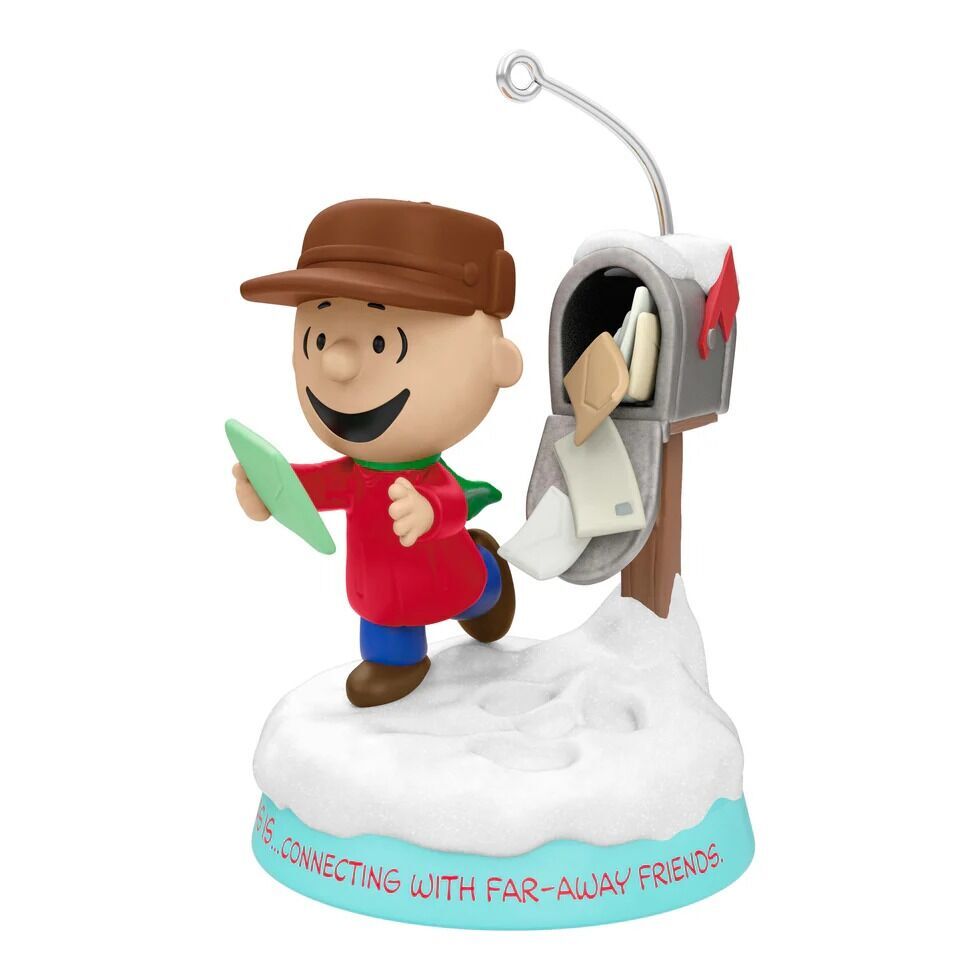 Christmas is ... so many happy things! Join the Peanuts Gang as they celebrate the many joys of Christmas with this new Hallmark Keepsake Ornament series. The first design in the series features Charlie Brown joyfully discovering the Christmas cards and letters filling his mailbox. A heartfelt sentiment about the scene accents the base of the ornament.