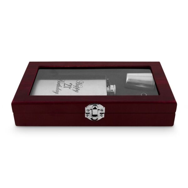 This sleek hip flask is the perfect gift for a 21st birthday. It comes complete with a cocktail mixing set, all in a latched wooden windowed gift box.