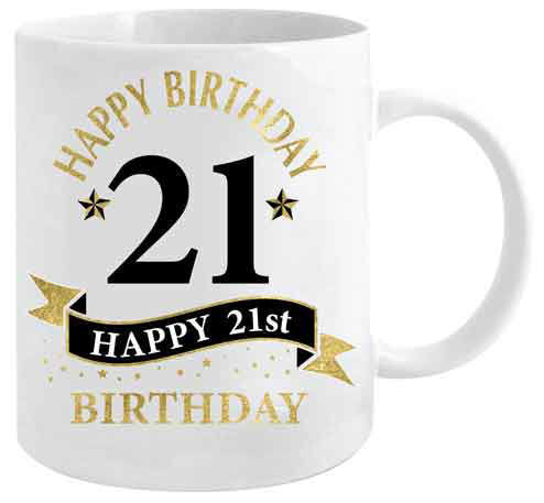 The mug is in white with black and gold text reading "Happy Birthday / 21 / Happy 21st Birthday".
