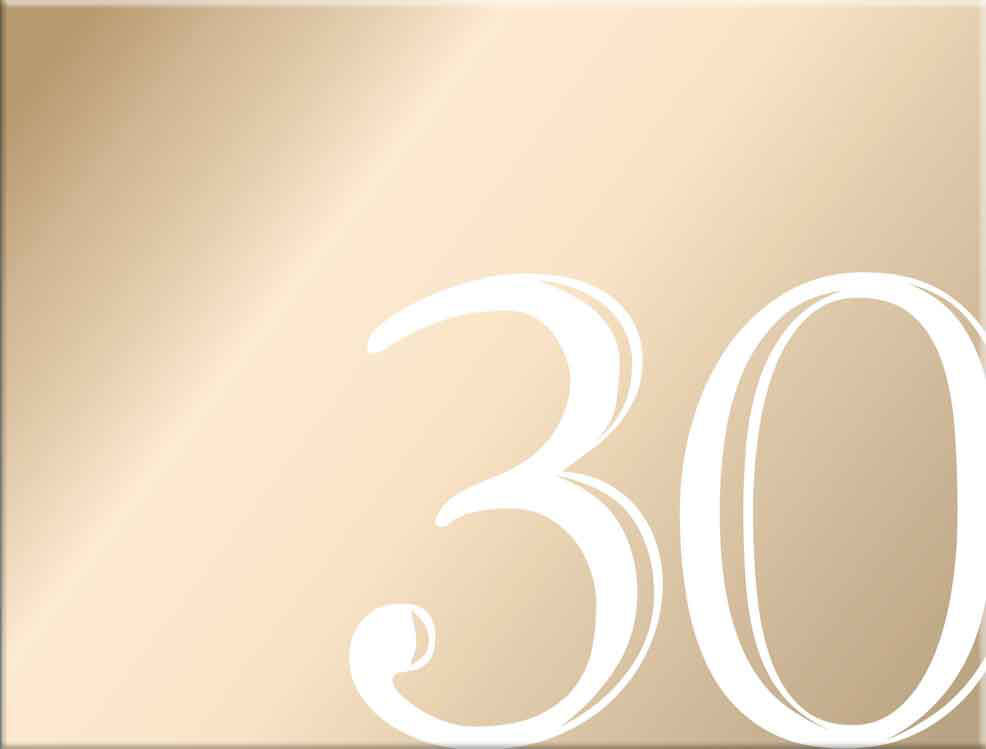 - Hard cover in rose gold, white text that reads "30".