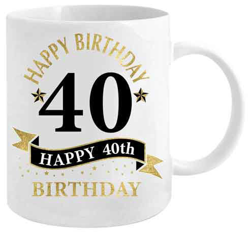 The mug is in white with black and gold text reading "Happy Birthday / 40 / Happy 40th Birthday".