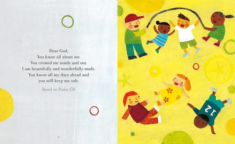 An illustrated gift book for a young child's baptism with a collection of prayers, including those based on bible verses, and pages for recording details, memories, and messages of the special occasion.