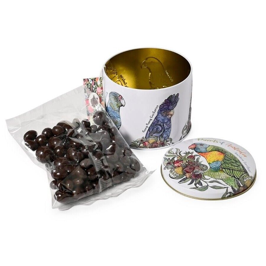 A tin full of an Australian-made mix of dark chocolated coated fruit, nuts and almonds. This tin is in the theme of Australian parrots, with different breeds like the eclectus and galah included in the design. A great gift for friends, family, coworkers and more.