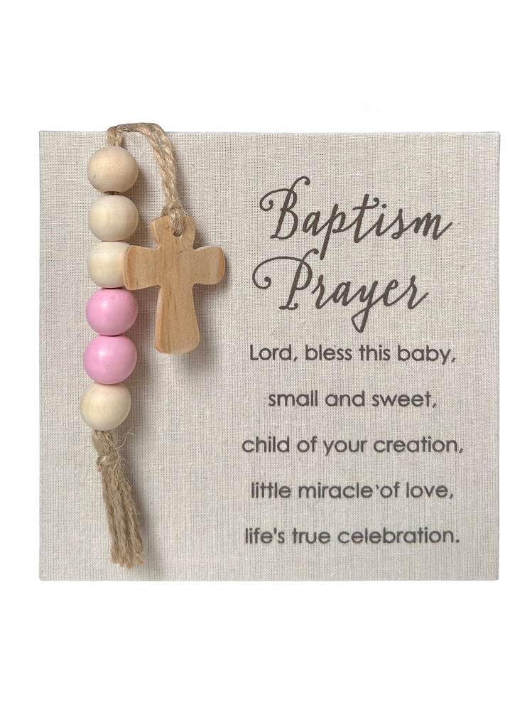 A beautiful fabric-covered MDF plaque with wood and jute accents, featuring a Baptism prayer. A jute string with wooden beads and a wooden cross sits to the side of the poem. Makes a beautiful gift for a Baptism.