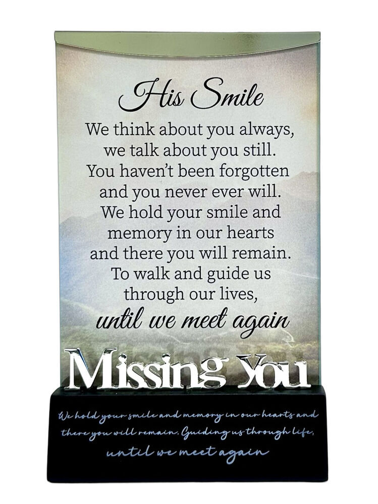 Message reads: 'His Smile. We think about you always, we talk about you still. You haven't been forgotten and you never ever will. We hold your smile and memory in our hearts and there you will remain. To walk and guide us through our lives, until we meet again. Missing You. We hold your smile and memory in our hearts and there you will remain. Guiding us through life, until we meet again.'