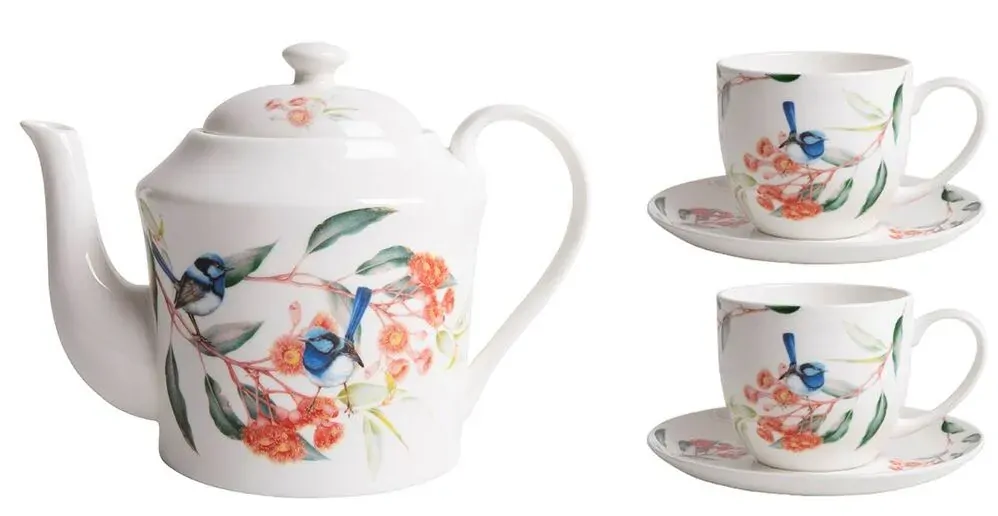 BLUE WREN & EUCALYPTUS - TEAPOT & 2 TEACUP SET