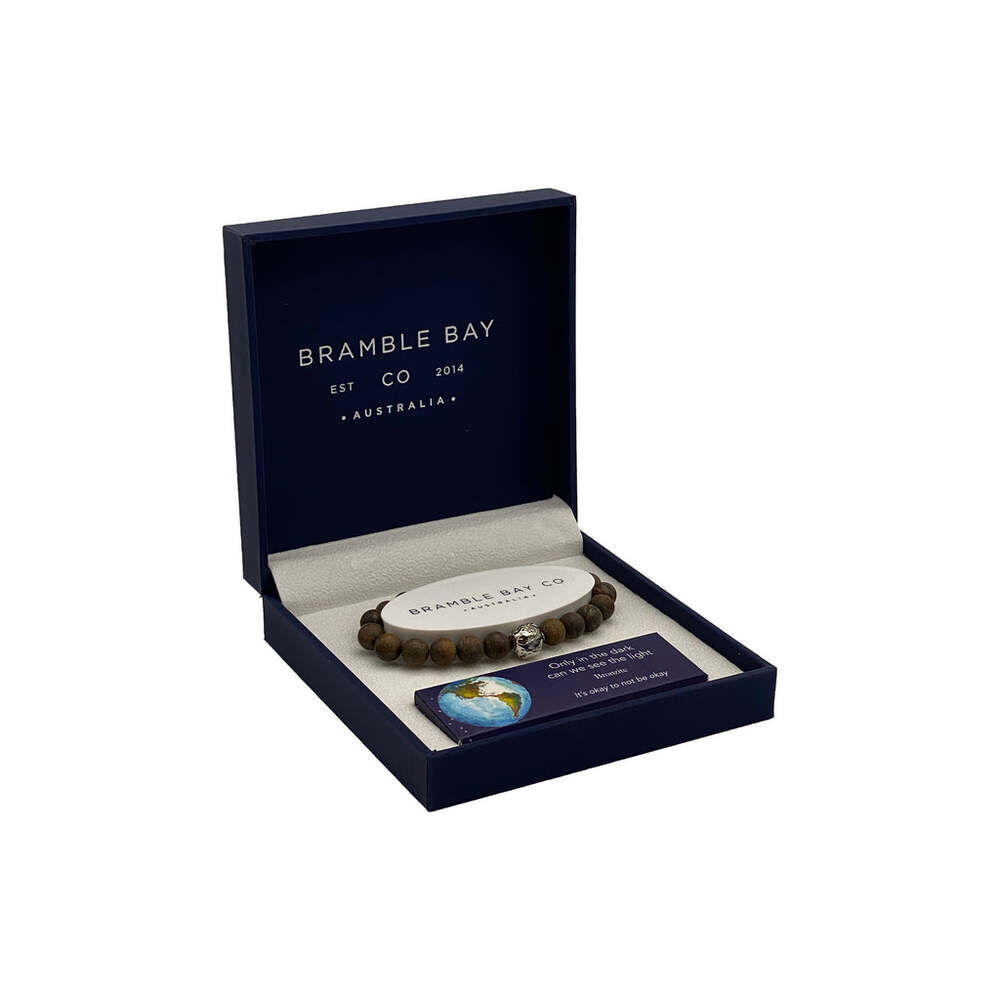 This bracelet is created using beautiful 8mm Bronzite beads with a silver Earth Charm and carded with the message "Only in the dark can we see the light"