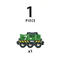 No cargo wagon is a challenge for this battery powered Freight Engine. Simply use the switch on top of the green toy train to move forward, stop and reverse. As the engine rolls forward with speed, you can see the headlights on the front light up to show the way.