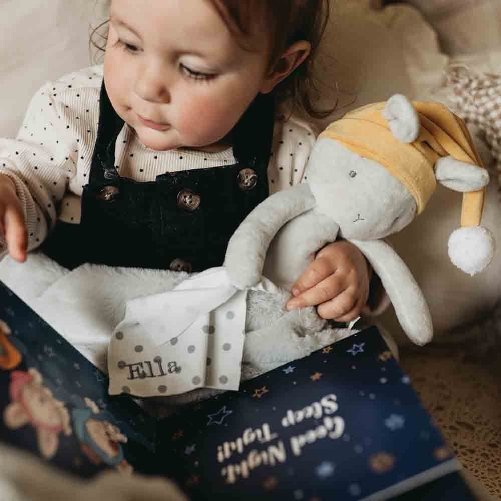 Send little ones off to Glad Dreams with these adorable bedtime plush friends from Bunnies by the Bay! Measuring 25cm tall, Sleepy Bloom Bunny features grey fur and holds a patterned blanket. Bloom wears a soft mustard-coloured snuggly nightcap, complete with pom pom on the end, and her ears poke out to top. Made from super-soft plush, this adorable sleepy friend makes a lovely gift for a wee little one.