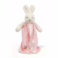 A smaller version of our best loved Blossom Blanket, this Lovey is ready to be on the go. With a handy loop on the back to attach to the car seat, stroller or crib  you're sure to never be left without this precious friend again. This favorite security blanket is a plush floppy eared bunny with hand crafted, baby-safe embroidered face and a snuggly soft white velour split blanket, lined and edged in silky satin. Signature three carrot tag for little ones fingers.