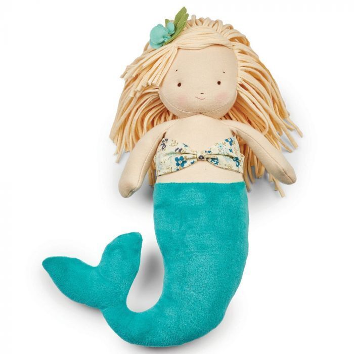 Little El-Sea mermaid joins her good friends by the bay for some delightful seaside play. Crafted from an incredibly soft fabric and perfectly sized for little hands, she's soft and lovable from head to tail with pale yellow knit hair, a blue/teal velour fish-tail, pretty flowers in her hair and a floral swim top. El-sea will make an endearing new friend for little girls as they play together, enjoy endless cuddles and plan adventures by the sea!