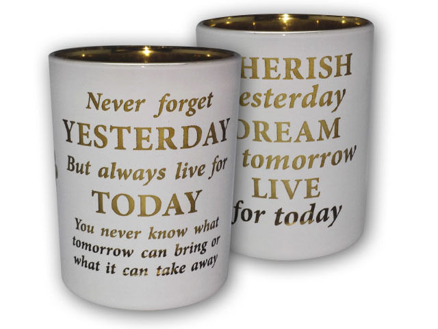 Candle Holder Reads: "Never forget yesterday, But always live for today. You never know what tomorrow can bring or what it can take away. Cherish yesterday, dream of tomorrow, Live for today."