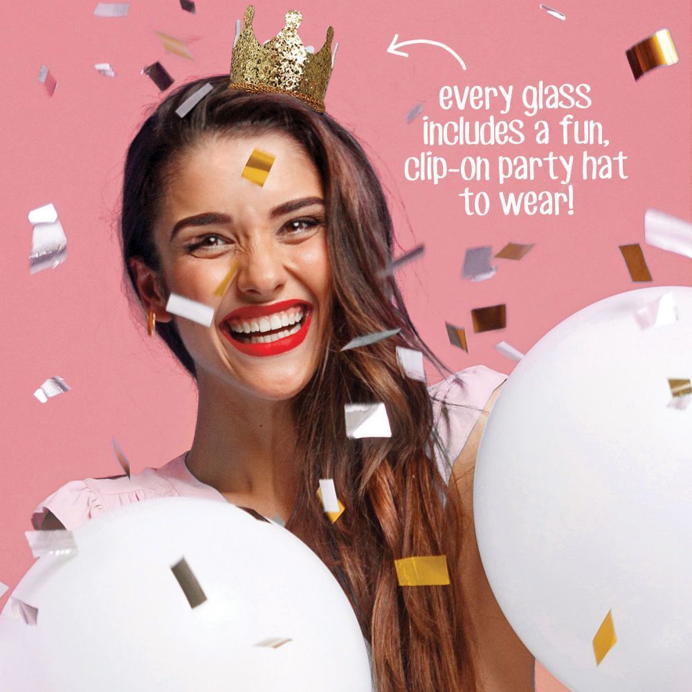 A fun way to celebrate the occasion. Give someone the ultimate gift with a stemless wine glass that also includes a fun, wearable party hat. This design for any celebration features a gold foil confetti print, with a wish that reads: ‘Congrats to you’.