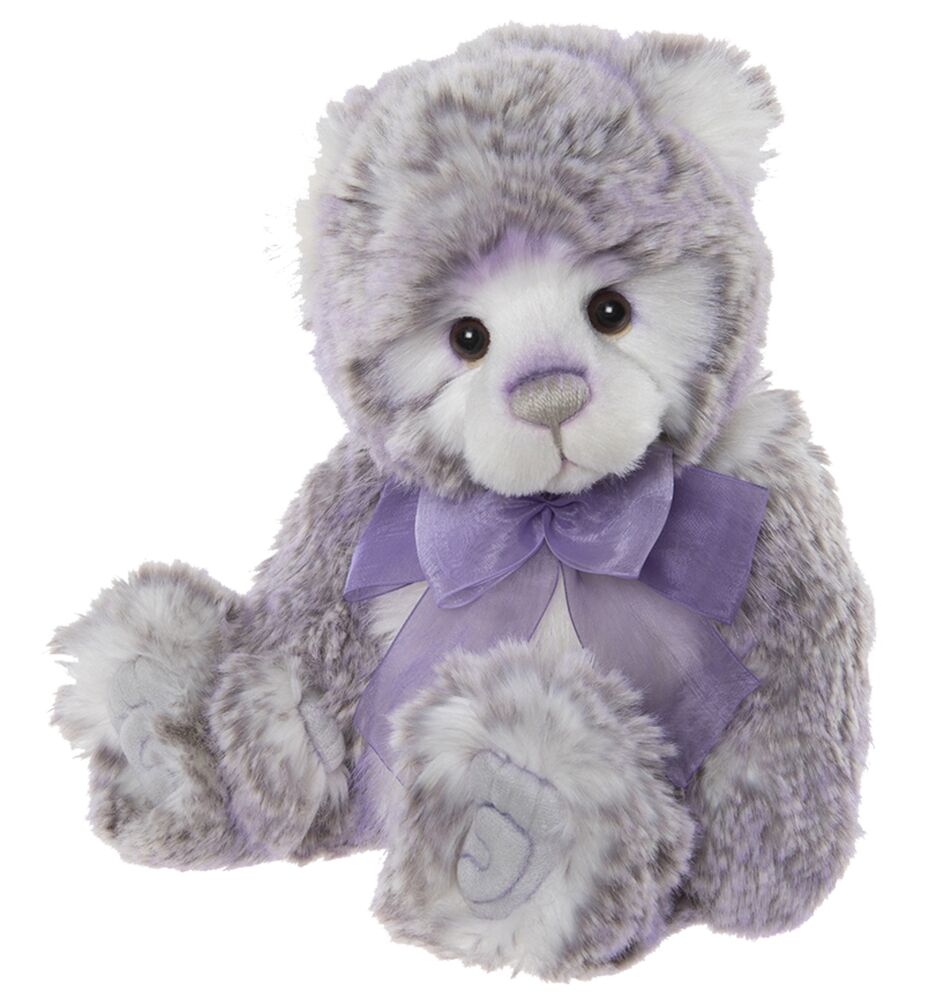Introducing Meghan, a beautifully crafted white and grey with purple tipping plush bear.