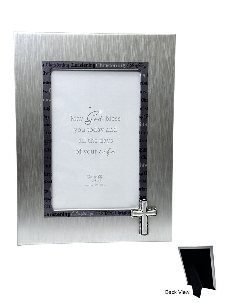 A beautiful silver photo frame to commemorate a Christening. There is space for a standard photo, with a silver 3D cross motif at the bottom right corner. Backing is in black velvet and has a leg to stand on. The perfect gift for a Christening.