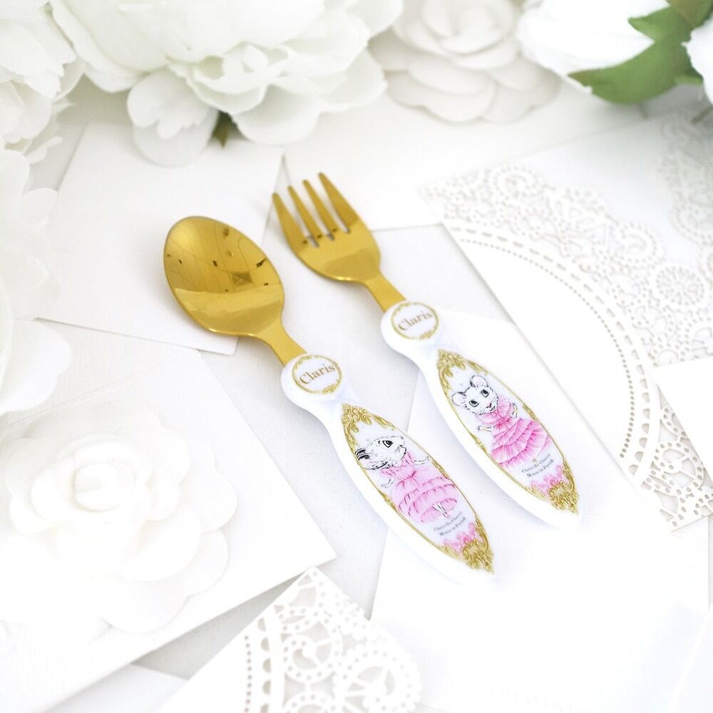 Oh La La! Bring a touch of luxury to the dining table with Claris the chicest mouse in Paris. This elegant and sophisticated gold stainless steel cutlery set includes a fork and spoon adorned with beautiful illustrations of Claris on the handles.