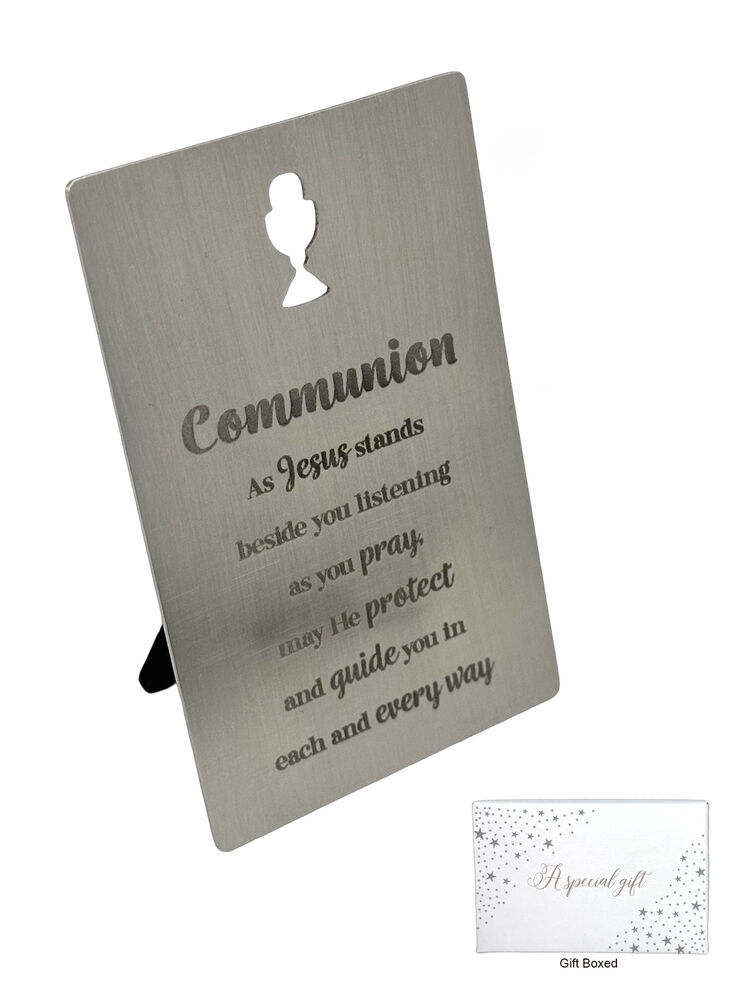 A beautiful stainless steel metal plaque with a leg for standing. The front has a cutout of a communion cup and reads: 'Communion. As Jesus stands beside you listening as you pray, may He protect and guide you in each and every way'. Comes in a white box decorated with silver stars and 'A special gift' written on the top in gold script. The perfect gift for a Holy Communion.