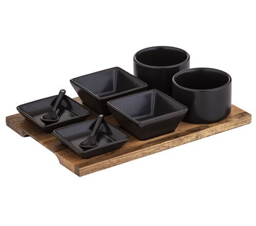 DAVIS & WADDELL TASTE FINE FOODS TASTING SET ON ACACIA TRAY - 9 PIECE SET