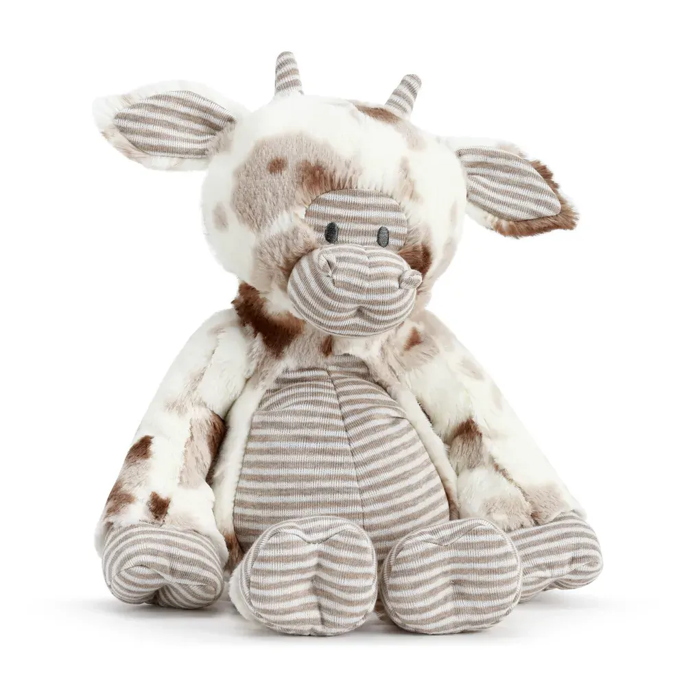 The Barnyard Cow Plush is a great gift for any child who could use a snuggler and a friend. As part of the Barnyard Baby Collection, this cuddly friend encourages playtime while learning about animal sounds. Makes a great gift along with coordinating Barnyard Cow Blankie and Barnyard Cow Rattle.