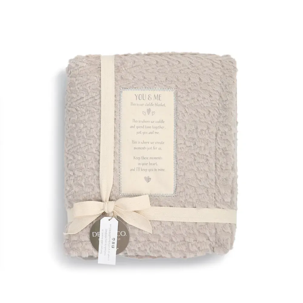 When you want to make those bonding moments with a loved one even more special, consider adding a piece from the Cuddle Moments Collection to your quiet times together. These keepsake-quality gifts from DEMDACO make sharing time with a child or a partner a wonderful memory. Each item is embroidered or decorated with a unique sentiment that honors those important relationships in our lives. The full-size You and Me Cuddle Blanket in off-white is a perfect piece for cuddling on the couch or sharing a bedtime story with your little one. It has a sewn-in sentiment that reads, "You & Me, this is our cuddle blanket... this is where we cuddle and spend time together... just you and me. This is where we create moments just for us. Keep these moments in your heart, and I'll keep you in mine."