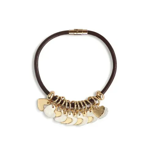 This leather bracelet with varied metal heart charms will delight the person you give it to. DEMDACO Heart Giving Bracelet Measures 7"" long and made of zinc alloy and leather. Magnetic closure.