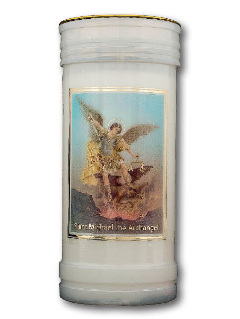 This devotional candle is white with a gold-coloured lid and features a beautiful image of St. Michael the Archangel.