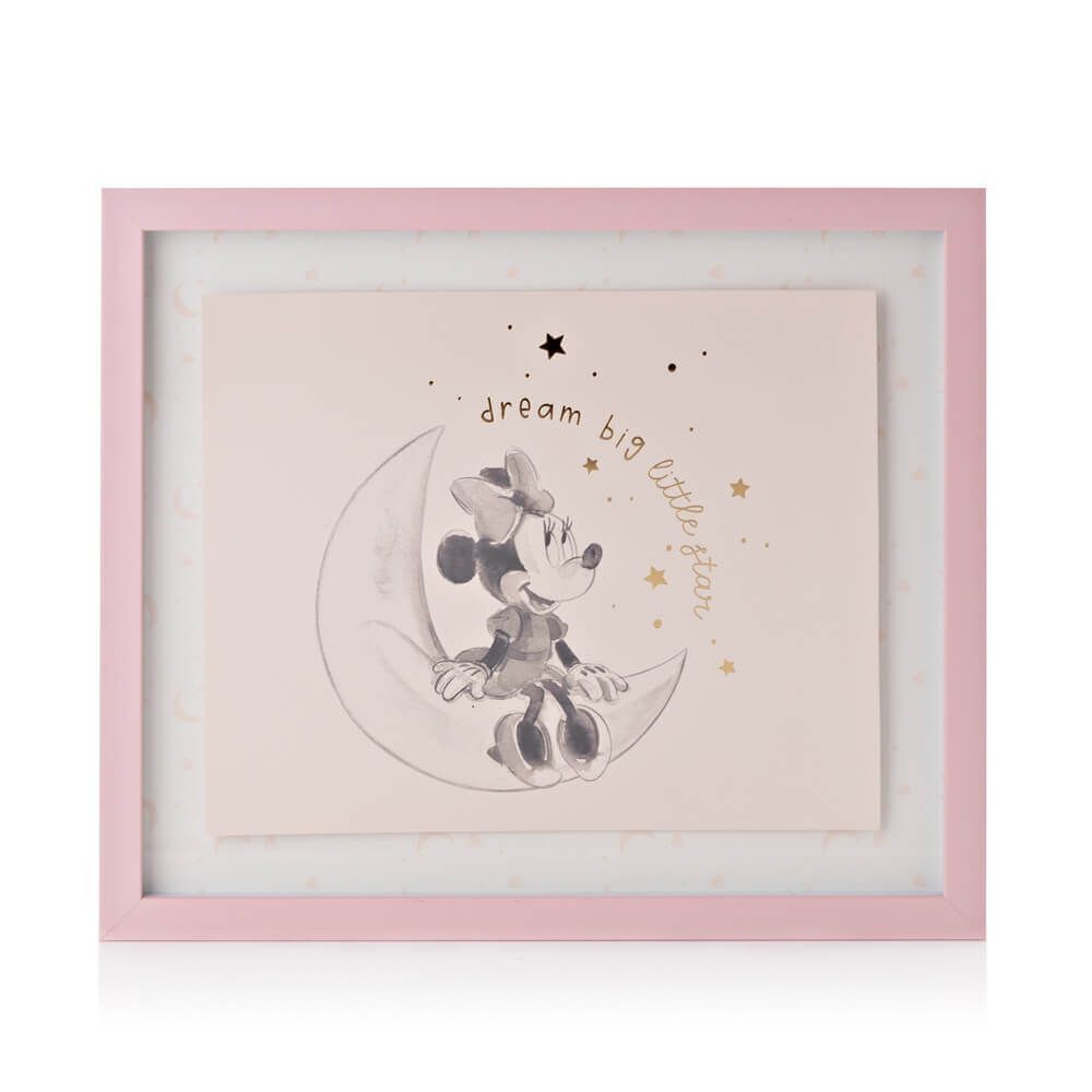 Remind your little one to dream big with this beautiful Minnie wall art. Complete with a sweet illustration of the iconic Minnie with gold foil features on a soft pink and white design, this accessory makes a beautiful addition to a nursery.Caption reads: Dream big little star.