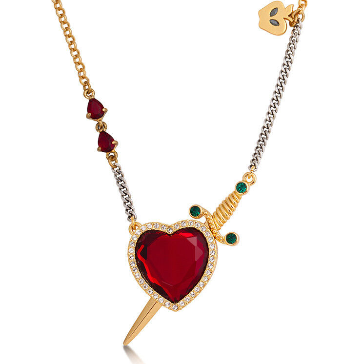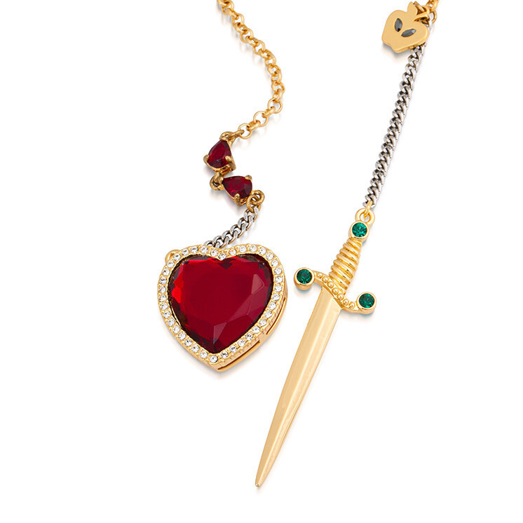 Intricate 14kt gold-plated necklace featuring a stunning heart and dagger design. The centrepiece is a red crystal heart which also functions as the clasp. The dagger is decorated with emerald green Swarovski ELEMENTS crystals and there are two more red crystals on the chain as well as an engraved apple hangtag. The chain has a matt silver-plated section. Truly stunning!