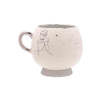 Premium ceramic Cinderella Mug with with silver inner and Disney 100 logo on the inside rim. Finished with a silver electroplated handle and rim, and an all over decal print with quote, character illustration and character logo. As a finishing touch, the mug is decorated with electroplated star details in silver.