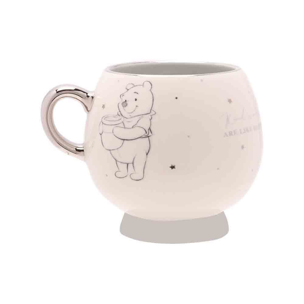 Premium ceramic Winnie the Pooh Mug with with silver inner and Disney 100 logo on the inside rim. Finished with a silver electroplated handle and rim, and an all over decal print with quote, character illustration and character logo. As a finishing touch, the mug is decorated with electroplated star details in silver.