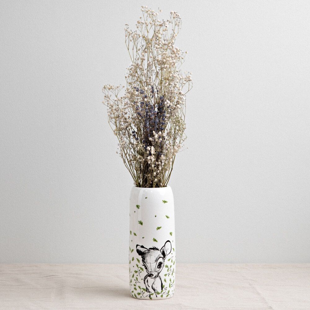 Enhance beautiful flower arrangements with this contemporary Disney Bambi vase. Featuring a beautiful pencil sketch image of Bambi, complete with natural colouring and additional forest design, this vase would be a perfect piece for a modern home.