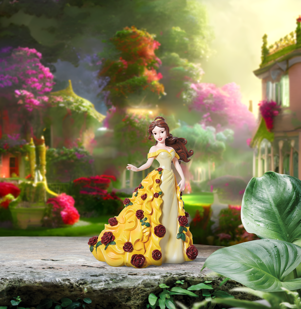 The beautiful princess Belle like you have never seen her before. In her iconic yellow ball gown with deep red 3 dimensional roses cascading down her dress. The iridescent finish creates a beautiful sheen... fit for a princess.