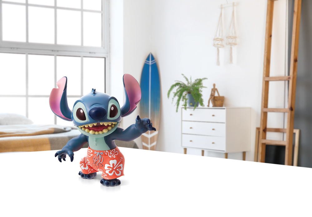 Stitch, the troublesome alien from Disney's Lilo and Stitch strikes an fun pose in this handcrafted design cast in stone resin with highly detailed swim trunks.