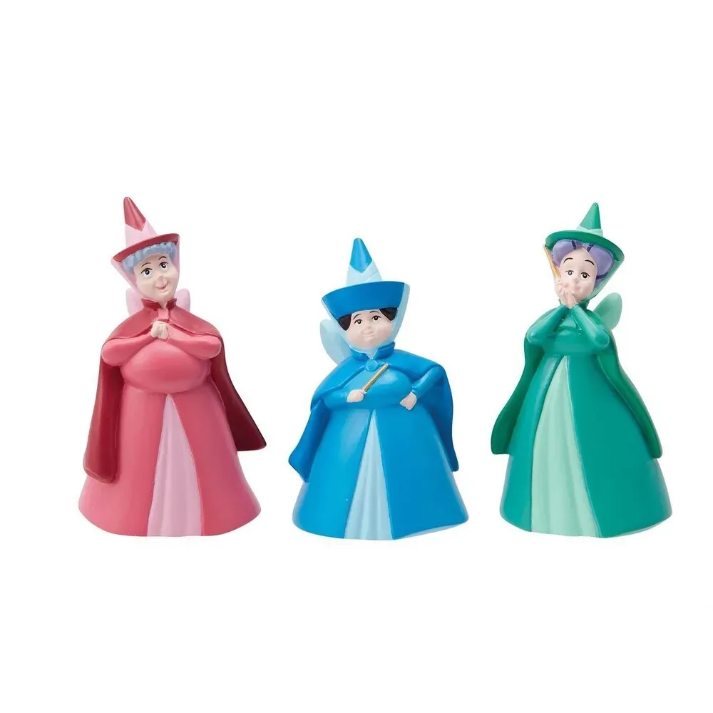 In time for the 65th Anniversary of the release of Sleeping Beauty, this miniature set of the three fairy godmothers, Flora, Fauna, Merryweather make the perfect scene completer for Sleeping Beauty fan when paired with Princess Aurora or Maleficent.