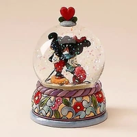 Mickey and Minnie smile lovingly at each other within a snow globe topped with a small red heart. Jim Shore's floral folk art adorns the base of the globe in spring shades of pink, blue, purple, green and red. Shake it and see the snow-like glitter and hearts fall around Disney's famous mouse couple.