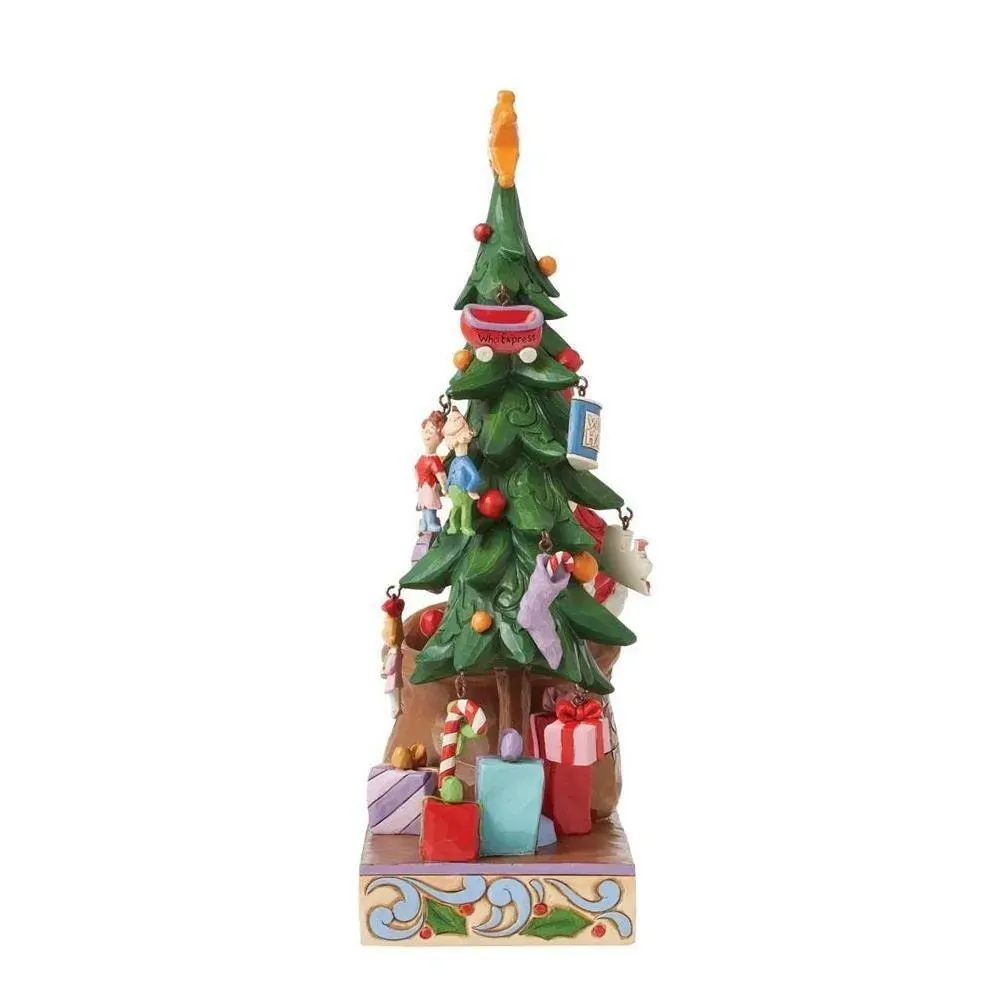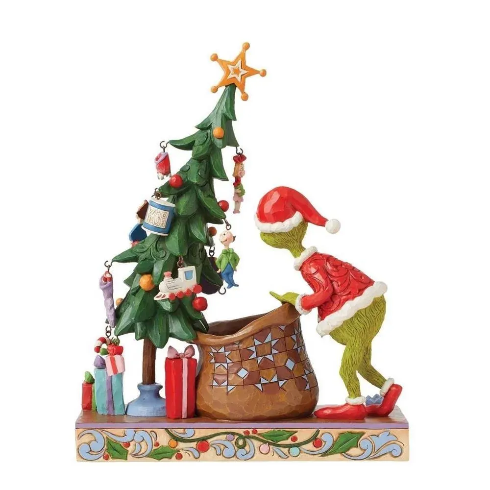 This Jim Shore creation makes a unique countdown calendar to Christmas. Dressed as Santa in a red rosemale suit, The Grinch presents a bag of Whoville=inspired ornaments to hang up on an ornamented Christmas tree. Hang up a new ornament each day!