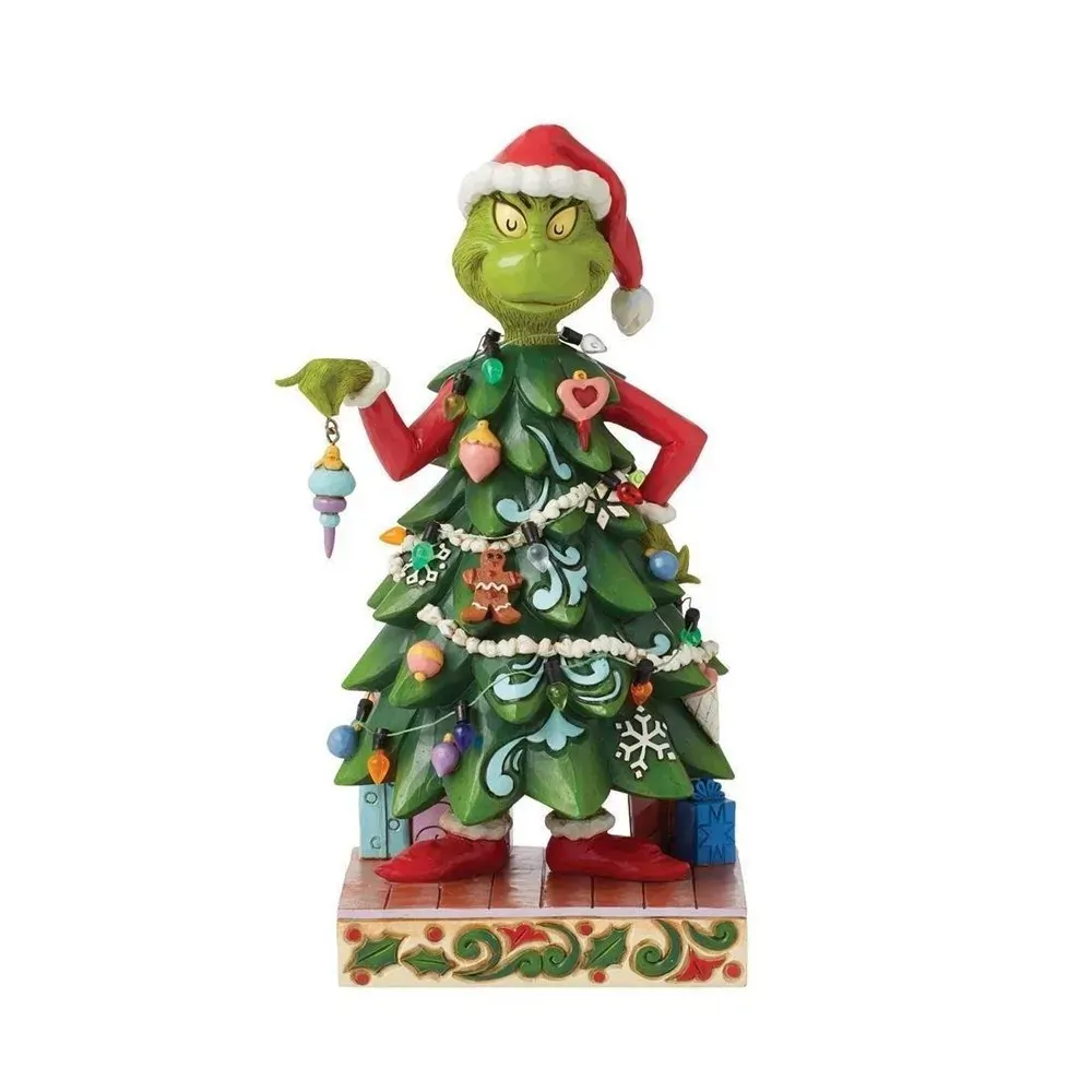 With a heart enlarged with holiday spirit and love, the Grinch smiles sincerely in this festive Jim Shore design. Dressed as a Christmas tree, Grinch wears a Santa hat and holds an ornament. This piece brings warmth to winter with decorative details.