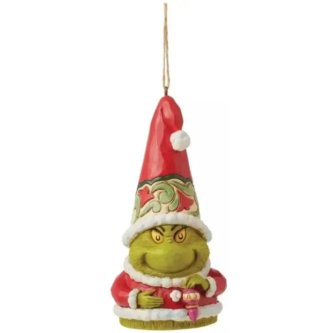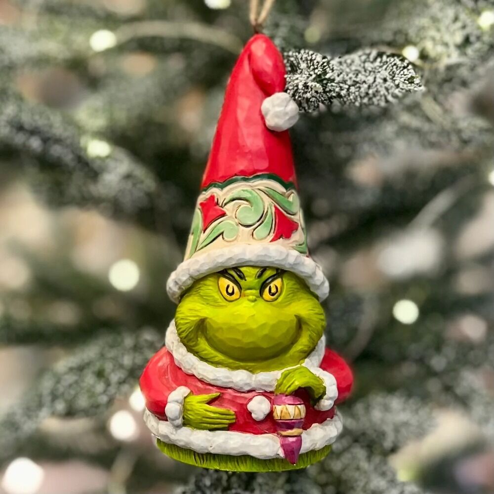 Known for his gnomes, Jim Shore presents a Dr. Seuss inspired ornament for your Christmas tree. With a Christmas towering hat and mischievous grin ornament this Grinch holds an ornament in hand as he hangs in your tree, threatening to steal more.