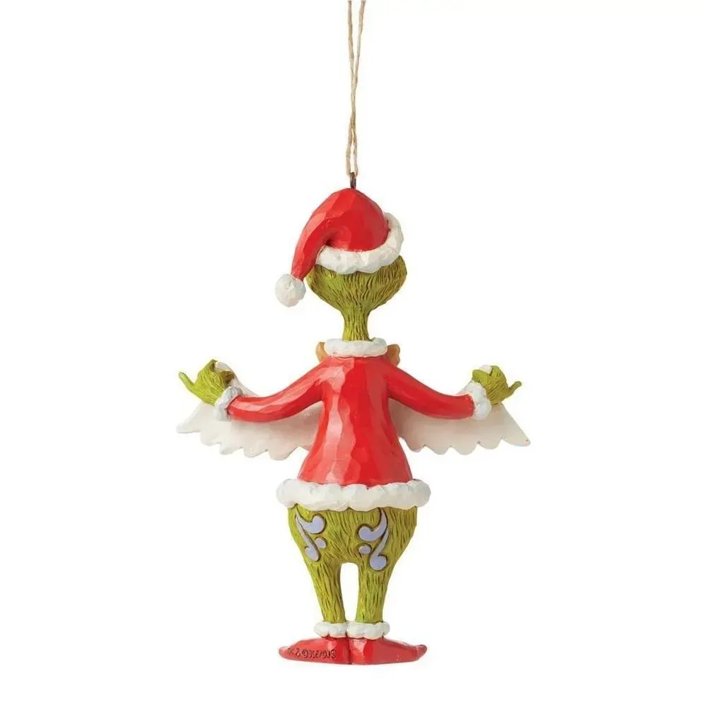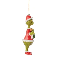 This Jim Shore ornament features The Grinch with a Merry Christmas banner and holiday wreath. With a bell and rosemale details, he wears a Santa suit and hat with a smile. Celebrate the season in style with this iconic Christmas character!