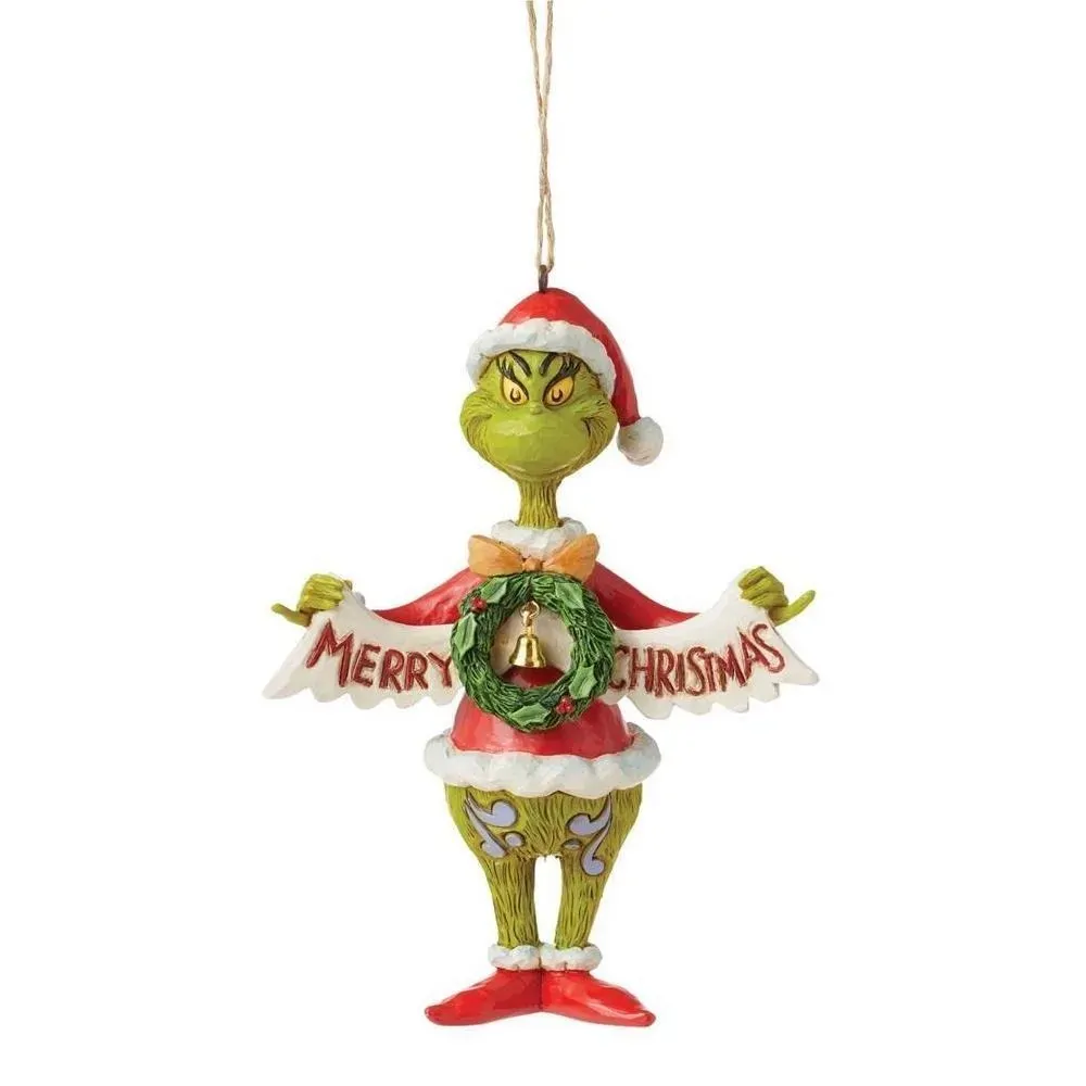 DR SEUSS THE GRINCH BY JIM SHORE - GRINCH HOLDING MERRY CHRISTMAS BANNER HANGING ORNAMENT