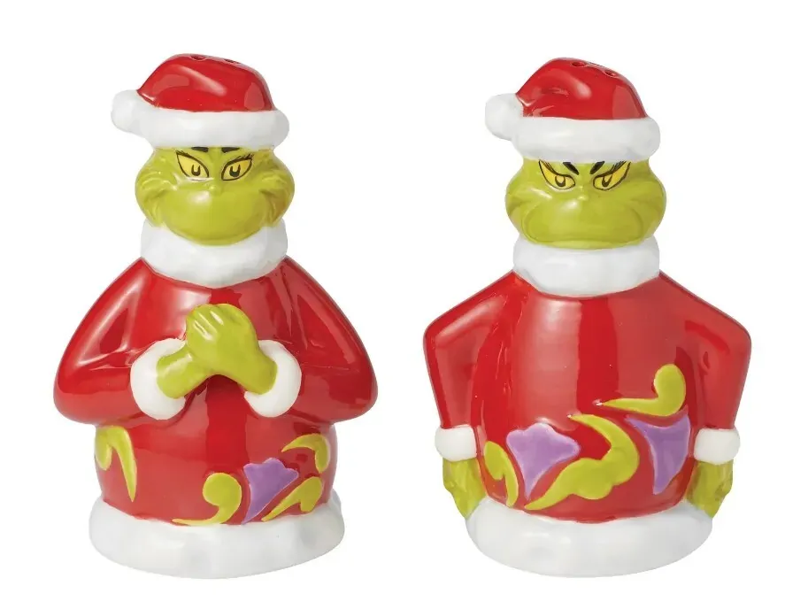 These festive salt and pepper shakers from Jim Shore feature the two sides of The Grinch. One Naughty, the other Nice, this set of seasonings bring style and spice to your holiday home decor.