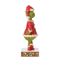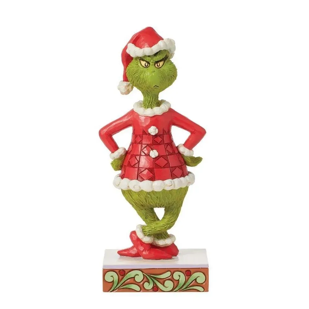 This Jim Shore design features The Grinch with his hands on his hips, wearing a frown. Dressed as Santa Claus, The Grinch wears a patchwork red suit on a rosemale stage. He plots to steal Christmas spirit with style and snark!