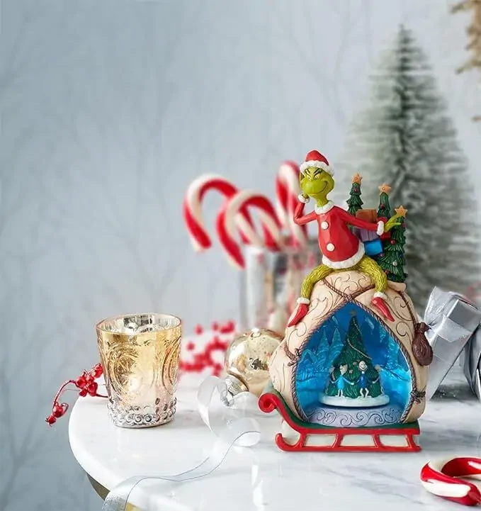 With a grin full of sin, this green Jim Shore Santa is coming to town to steal Christmas! He sits, listens and plots above as the Whos sing and dance around the Christmas tree in a lit alcove. Celebrate the season with everyone's favorite curmudgeon.