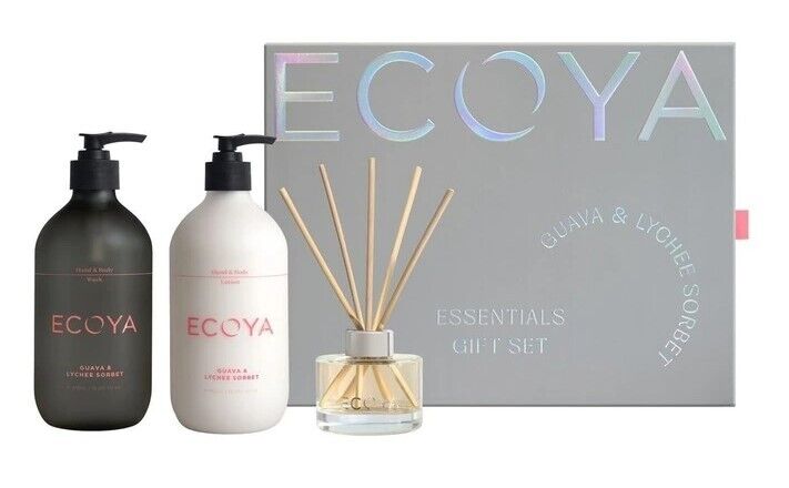 The essentials gift set includes our luxurious hand & body wash, hand & body lotion and mini diffuser in our best-selling fragrance, Guava & Lychee Sorbet.
